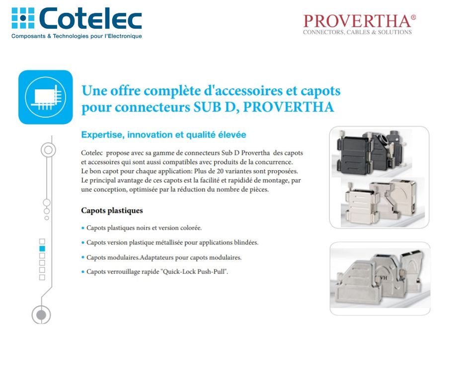 L’offre complète d’accessoires et de capots pour connecteurs SUB D de PROVERTHA se distingue par sa qualité, sa compatibilité, sa variété d’options, sa facilité de montage et ses fonctionnalités avancées. Elle répond aux besoins de nombreux secteurs d’activité en offrant une solution fiable et flexible pour les applications de connectique SUB D.Pour toute information, contactez les ingénieurs Cotelec !